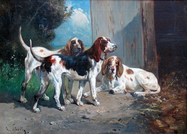 Three hounds outside a kennel