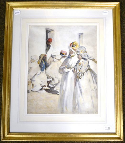 Moorish figures gathered outside a building