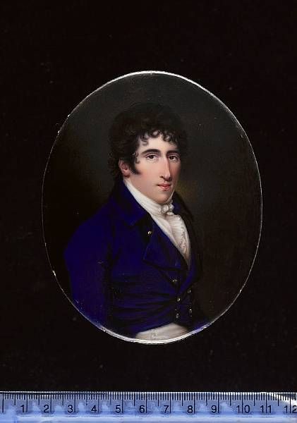 William Wix, wearing blue coat, white waistcoat, frilled chemise, tied stock and breeches.