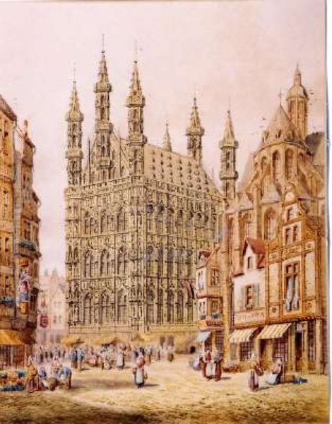 | Marktszene in Löwen mit dem gotischen Rathaus und anderen Gebäuden | |