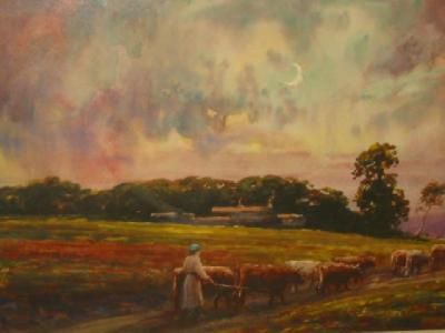 Drover and Cattle on a Country Lane at Dusk