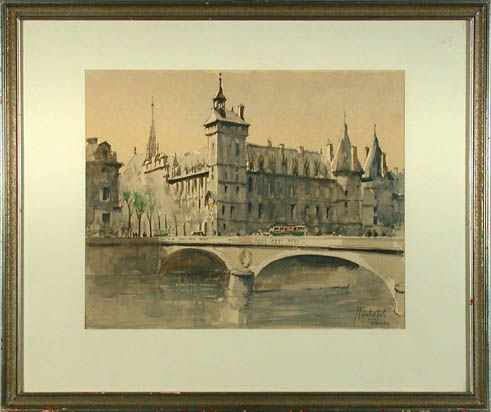 | Partie in Paris Blick auf die Pont Napoléon III mit umgebenden Gebäuden, im Hintergrund der Turm der Sainte-Chapelle | |