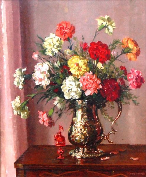 | Still life with flowers in a silver jug with ivory chess piece | |