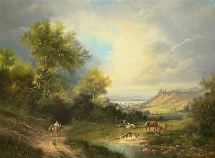 Romantische Landschaft mit Tieren und Reisigsammlern an einem Teich