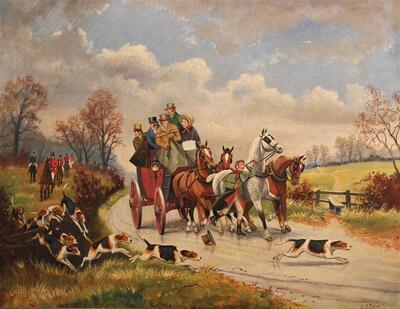 | A HUNT SCENE WITH HORSE-DRAWN CARRIAGE | |