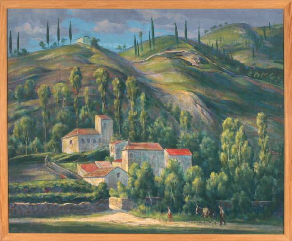 | Bauernpaar mit Esel vor einem Gehöft am Fuße eines Hügels in toskanischer Landschaft | |