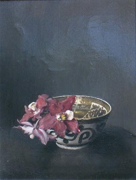 Stilleven met orchideeën in Chinese kom