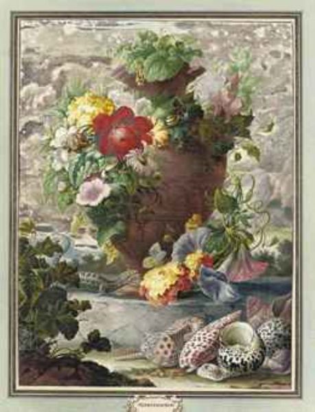 | A spray of chrysanthemums, a fritillary, pink hollyhock, morning glory and a red dahlia in an urn, with various shells and a liz | |