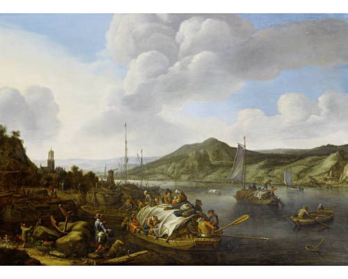 | A Rhenish capriccio with travellers approaching a shore on barges, a port and a village in the distance | |