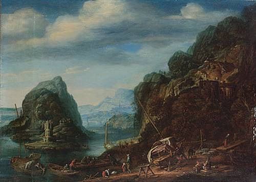 | A Rhenish river landscape with shipwrights repairing a sailing vessel and other figures boarding vessels on the shore, a rocky i | |