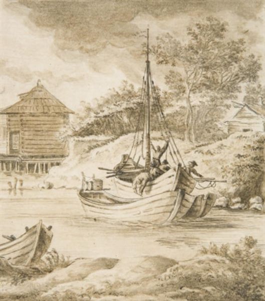| Un paysage de rivière avec des marins amarrant un bateau (recto) | |