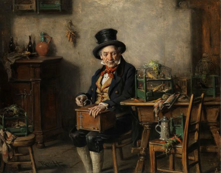 ALTER MANN MIT SPIELUHR AN EINEM VOGELKÄFIG
