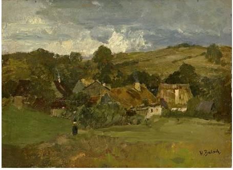 Dorf mit Figurenstaffage in hügeliger Landschaft