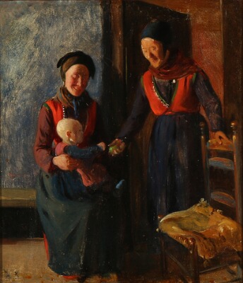 | A scene from Rømø, Denmark, with a child and two women dressed in national costumes | |