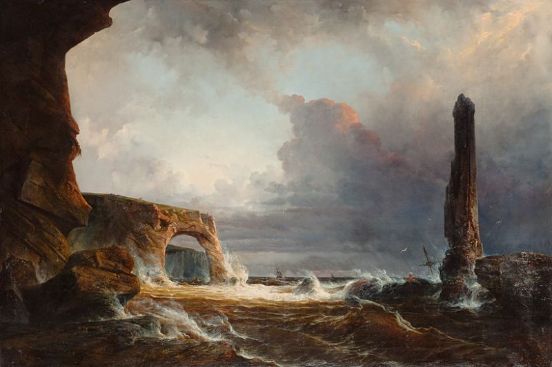 | Gewittersturm über der Küste von Süd-Wales, Penmaen-Bay. Felsentor und gitschendes Meer. An Felsnadel gegen die Wellen kämpfende | |
