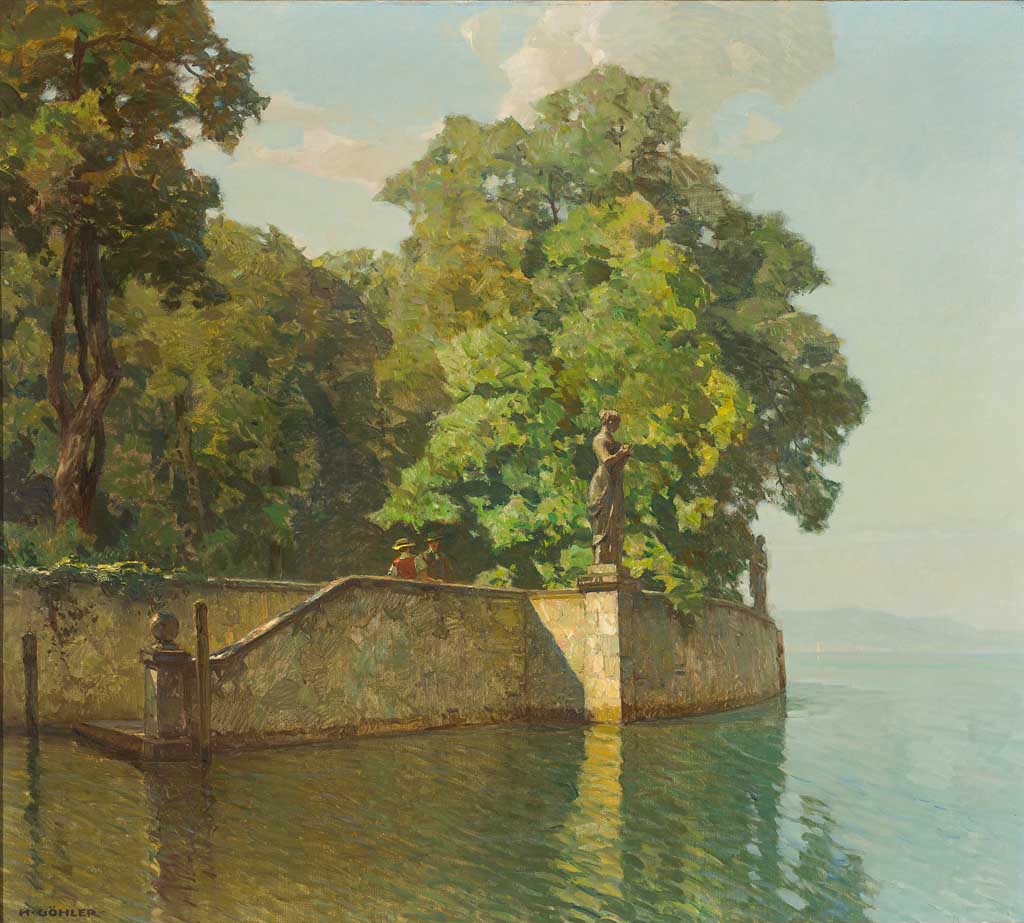 Blick auf steinerne Ufermauer mit Figuren im sonnigen Licht. Weiter Blick über den See