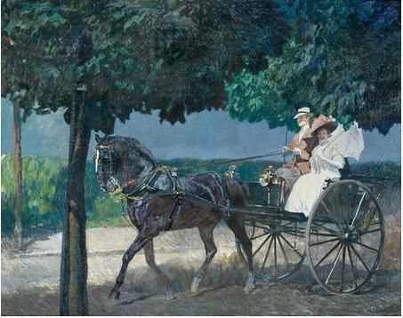 | 'Tempera, nicht firnissen'. Elegantes Paar in einspännigem Cabriolet bei der Ausfahrt auf einer schattigen Chaussee. | |