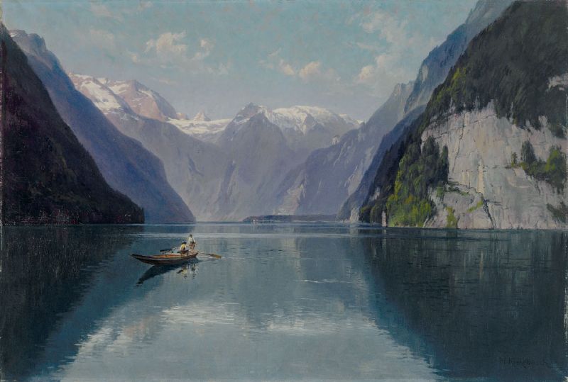 Blick über den Königssee mit übersetzendem Boot auf St. Bartholomä und das Watzmannmassiv