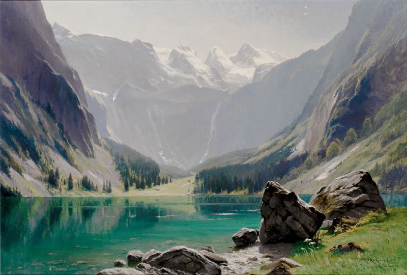 Blick über den See auf malerisch beleuchtetes Gebirgsmassiv