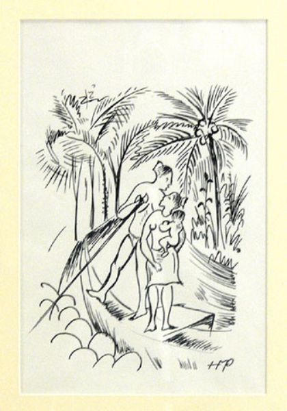 abstrakte Darstellung zweier Eingeborener mit Kind umgeben von Palmen