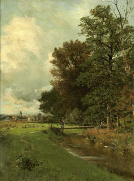 | Bäuerin auf einer kleinen Holzbrücke über einem Bach am Waldrand, im Hintergrund ein bayrisches Dorf | |