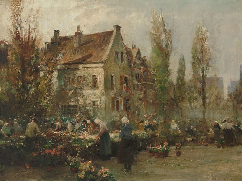 | Holländischer Blumenmarkt vor malerischer Häuserfassade mit sonnigem Lichteinfall. | |