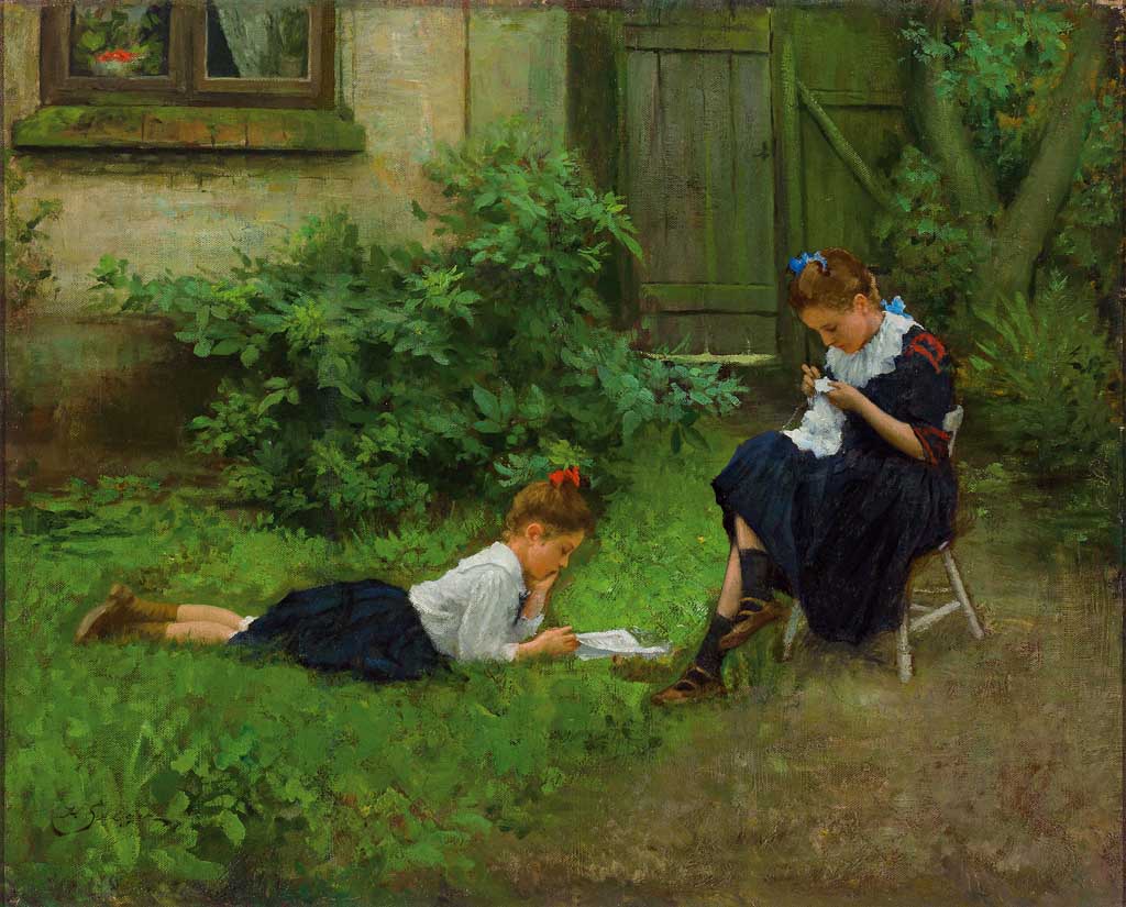 Zwei reizende kleine Mädchen im Garten beim Lesen und Sticken