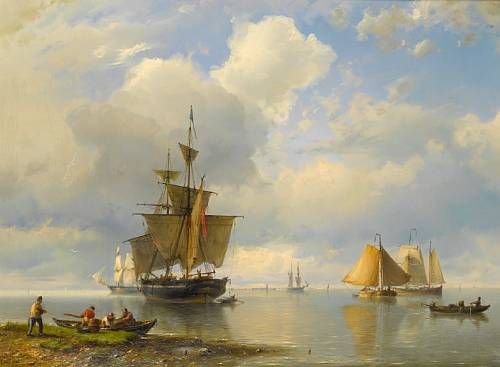 | A Dutch barge leaving harbour on the tide, with a merchantman anchored offshore | |