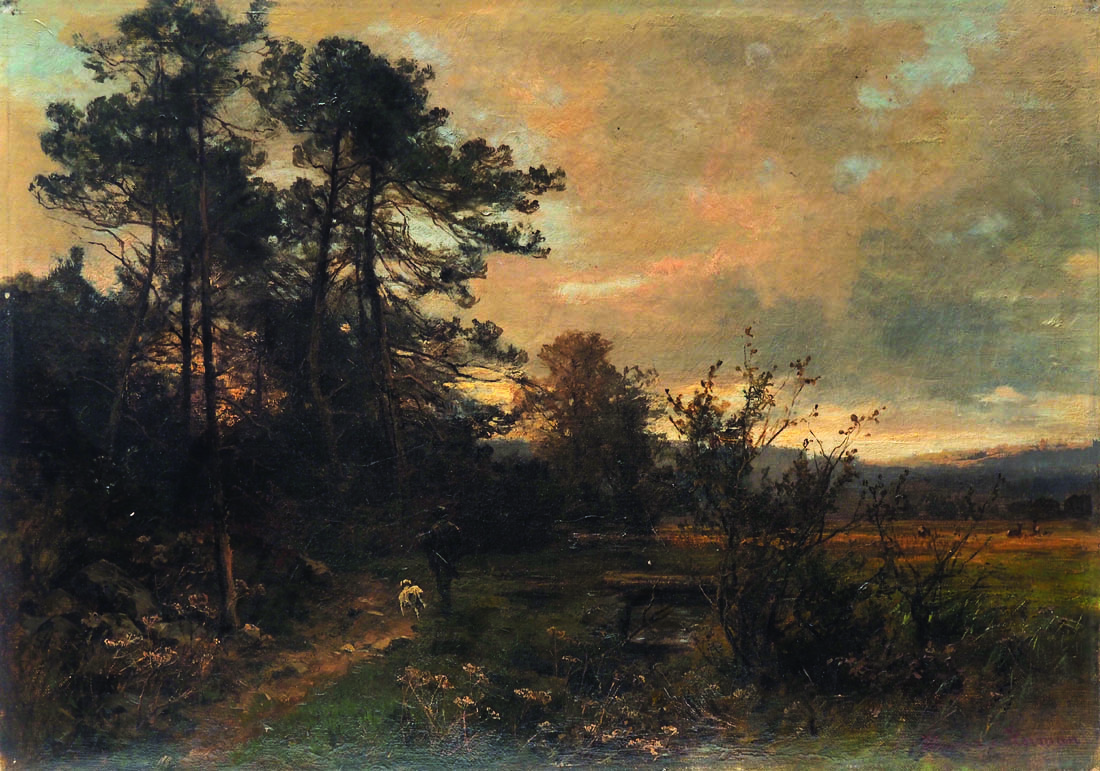 Lonely forest lake in the morning light, in the foreground under the tall trees on the shore a lonely hunter with a dog
