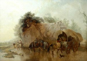 Horses and carts crossing a stream