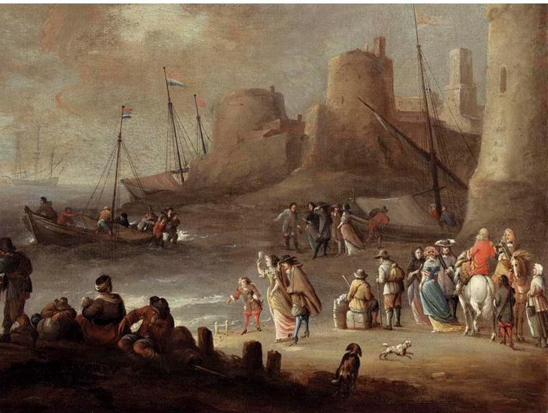 | A MEDITERRANEAN COASTAL LANDSCAPE WITH ELEGANT FIGURES ON A BEACH WITH FISHERMEN UNLOADING THEIR CATCH, A FORTIFIED TOWN BEYOND | |
