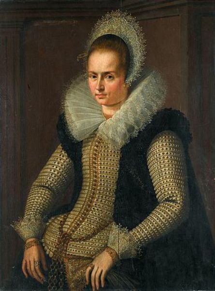 | PORTRAIT OF LADY, HALF LENGTH, WEARING A BLACK AND GOLD DRESS WITH A BROAD WHITE LACE COLLAR | |