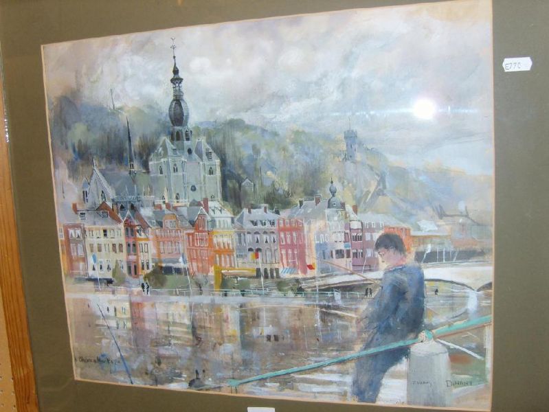 | A continental townscape with figure fishing beside a canal, with church to the background | |