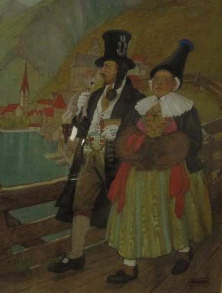 Tyrolean Figures on a path, with a Lake and buildings beyond