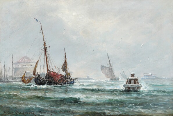 | Seascape with sailing ships entering the harbor of Frederikshavn, background the Powder | |