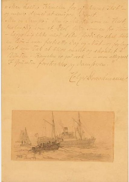 | Seascape with a steamer, sailing ship and dinghy, mounted on a sheet with a text from the artist | |