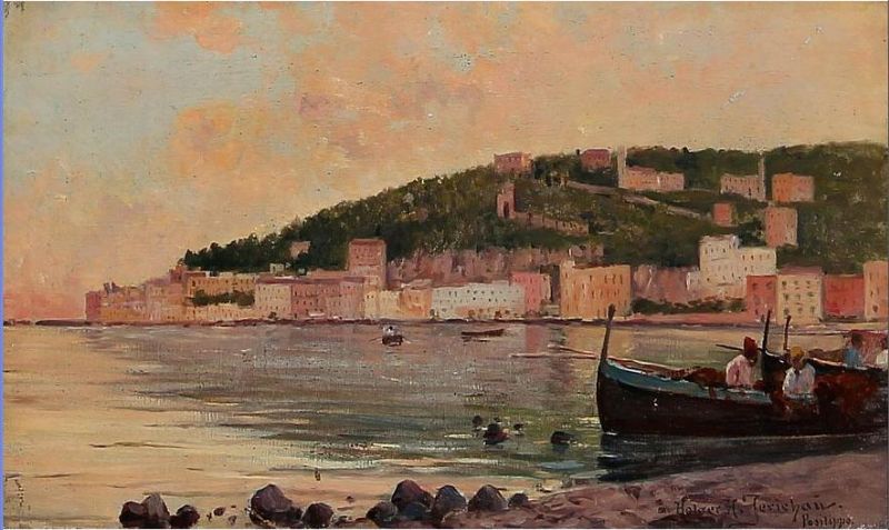 | Coastal scene from Posilipo in Italy with fishermen on the way out in their rowboats | |