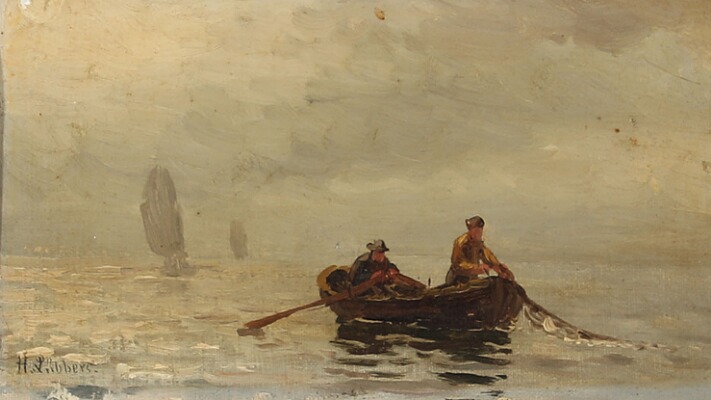 | Seascape with a rowboat and sailing boats on the horizon. | |