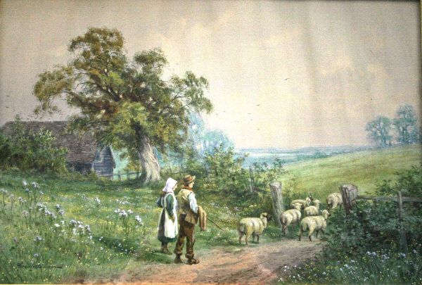Figures with sheep in landscape with tree and building and "Horse and cart crossing the river with figures and rolling hills in