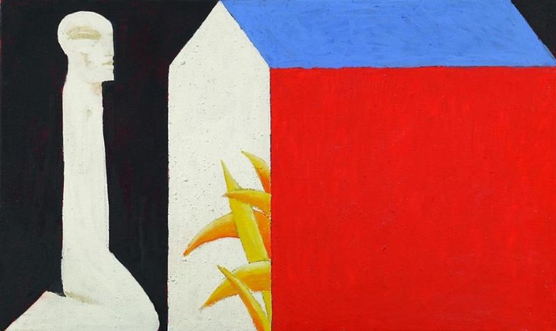 Knieende Figur und Haus (weiß, blau, rot). 1987.