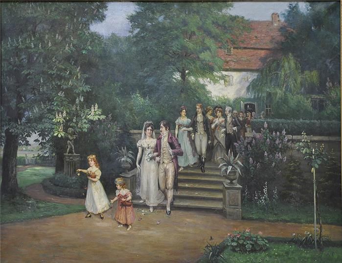 Elegante Hochzeitsgesellschaft, aus einer Villa kommend.