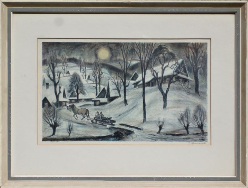 Sáně tažené koňmi valašskou vesnicí v měsíční noci