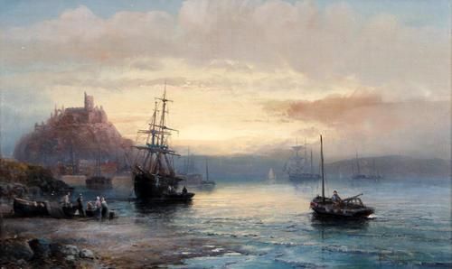 St. Michael's Mount with fishing boats before and fisherfolk on the shore