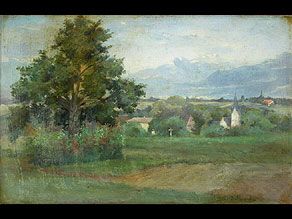 | LANDSCHAFT MIT BAUMGRUPPE, VERSCHNEITEN BERGEN UND IM TAL LIEGENDEM DORF MIT KIRCHTURM | |