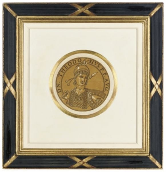| Portrait Medallions of Roman Emperors: Otho dei Gratia Rex; Claudius Caesar; Caes. Aemillianus; and Theodosius | |