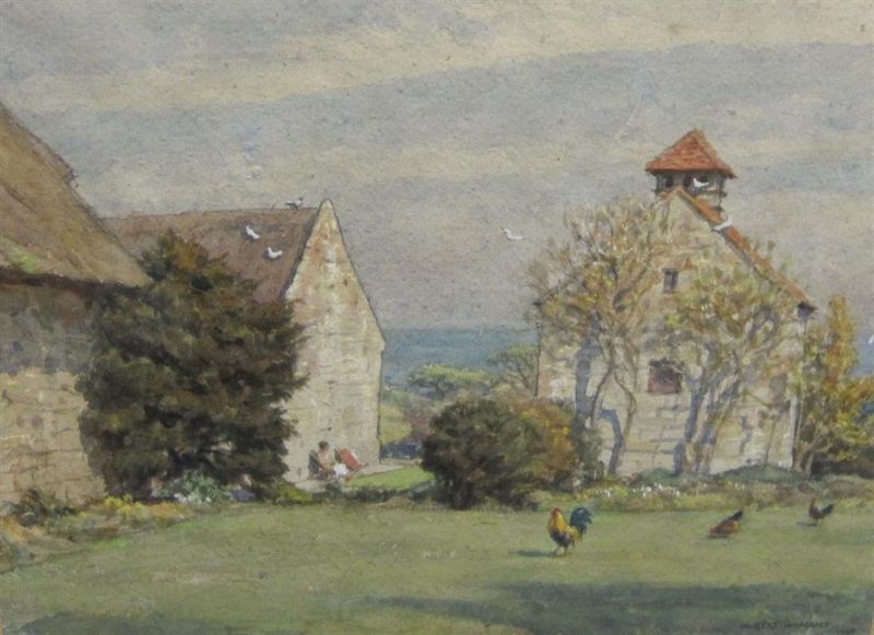 Farmbuildings with chickens on a lawn nearby, said to be on The Isle of Wight