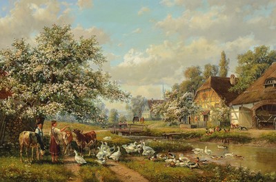 | children with cattle, geese, ducks in front of a rural village view, in the background children on the bridge and horses, very f | |