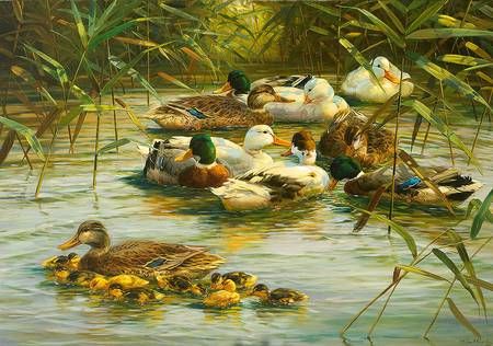 Enten mit Küken im Schilf. Meisterliche Schilderung