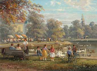 Parklandschaft mit See und Biergarten