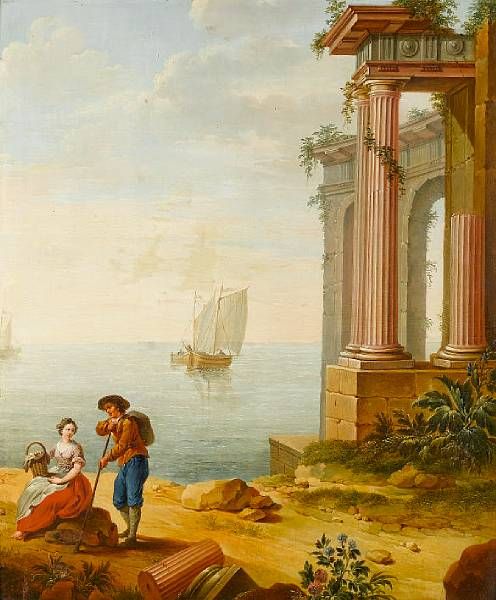 A Mediterranean coastline with travellers resting before ruins